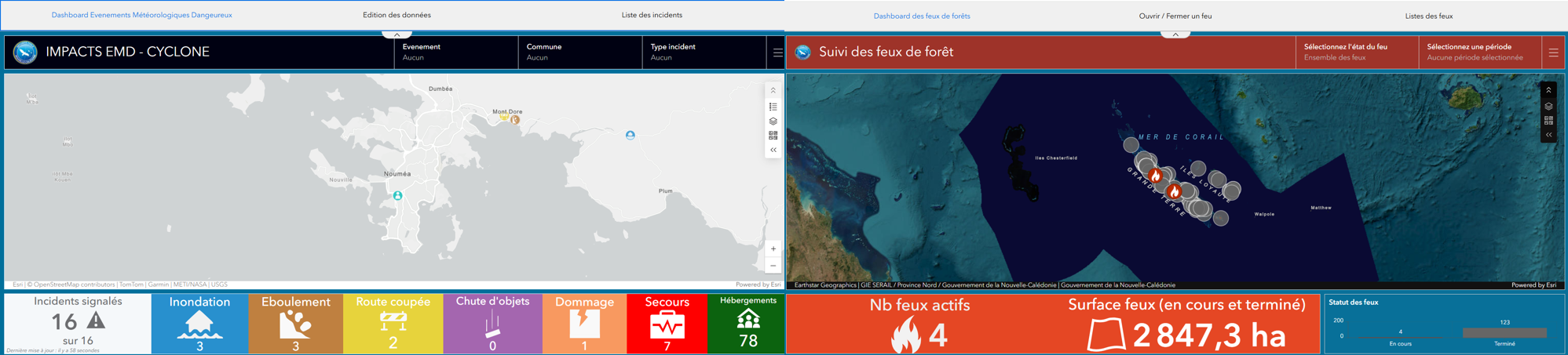 Suite de supervision en temps réel des cyclones et feux de forêts, associant une application mobile QuickCapture pour la collecte terrain à un tableau de bord ArcGIS pour l'aide à la décision.