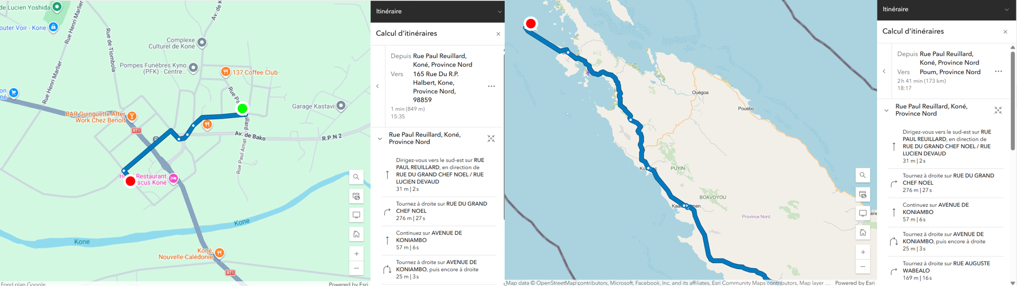 Service d'itinéraire multimodal pour la Province Nord construit avec ArcGIS Pro Network Analyst et un NetworkDataset dédié, publié via ArcGIS Server sur ArcGIS Online et exposé dans une application Experience Builder.